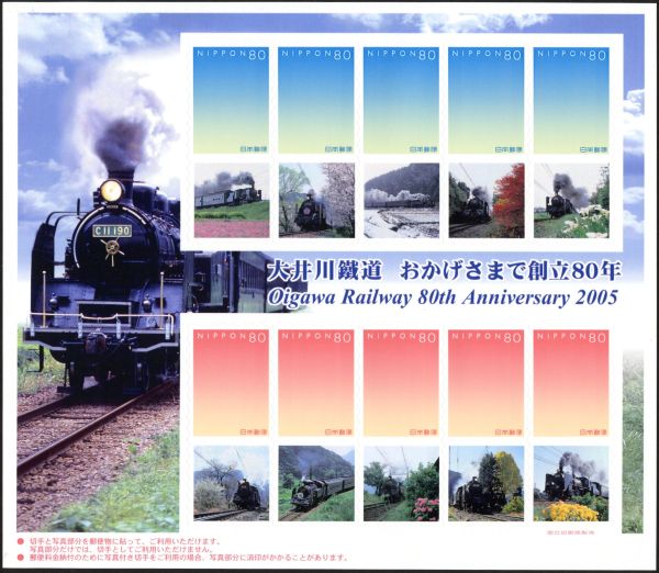 | 大井川鐵道が創立80年になるのを記念して、関連会社の南アルプス産業から発売された写真付き切手。同社のウェブサイトでは、シートがウォルソル社製になっていたが、実際に発売されてみると国立印刷所製造になっていた。50万シート納入されたウォルソル社製シートがなくなり、再び国立印刷所に戻って発売されたようだ。通販のほか、金谷駅・新金谷駅・千頭駅売店と、新金谷駅前のプラザロコでも購入することができた。タブ画像には、C11やC56が牽引する同社のSL急行列車が描かれている。 |