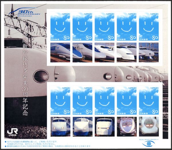 | 1975(昭和50)年3月10日に山陽新幹線の岡山〜博多が開業し、新大阪〜博多間の山陽新幹線全線開業から30周年になるのを記念して制作された写真付き切手。2005年3月に実施された、博多デイトス(新幹線開業と同時にできた駅ビルのショッピング街)のキャンペーンや、2月5日〜5月31日に実施された山陽新幹線全線踏破スタンプラリーで、全19駅を集めた人が応募できるJR賞の賞品として、それぞれの当選者に配布された。 |